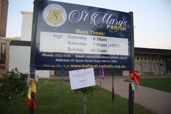 RIBBONS were tied to the local Catholic parish in a sign of support to local child sex abuse victims, ahead of Cardinal George Pell’s address to the child abuse royal commission next week.