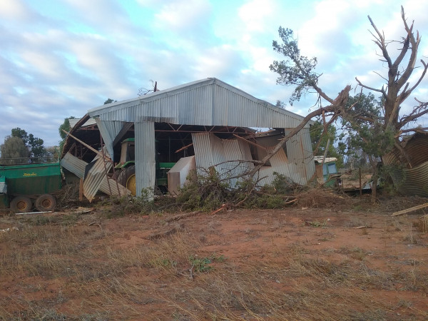 “It picked up a piece of tin and pierced the sprayer tyre, it has uplifted our loading ramp and poly tank and smashed them into the ground, and it blew out the windows on our grader.”