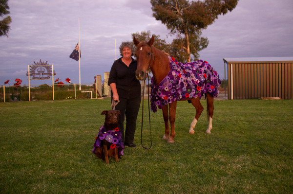 ONE thousand hand-stitched purple poppies were woven into a blanket and draped over a horse and dog during the ANZAC Day Dawn Service in Woorinen.