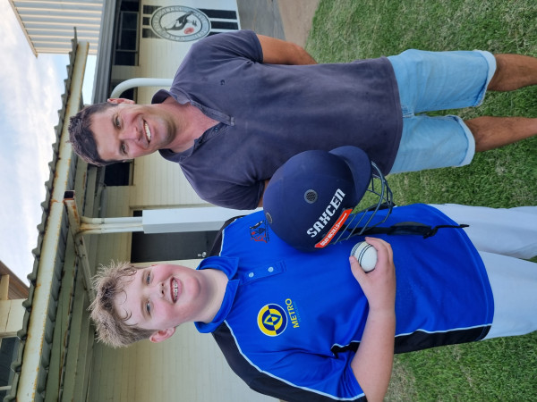 One young local cricketer achieved a feat most strive their whole careers for last Friday night – by taking a hat-trick.Saxcen Cameron, who plays for the Lakers Cricket Club Under 11’s took three wickets with three consecutive balls against the Northern Razorbacks at Lake Boga at the weekend. Saxcen is pictured with his coach John Lazarou -with the ball which will no doubt take pride of place in the Cameron home.