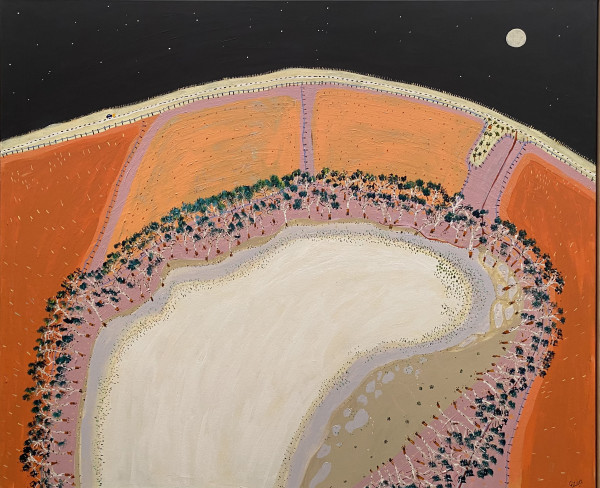 “Driving past Lake Tooim” acrylic on canvas 2022, is painted in Wayne’s signature naïve style, an aerial perspective with aspects of the view “flattened” and other areas of the painting reading as if you are looking through binoculars.