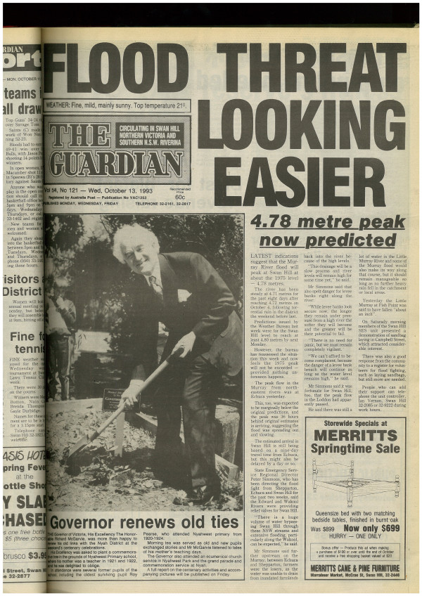 State Emergency Service Regional Director Peter Simmons, who has been directing the flood fight from Shepparton, Echuca and Swan Hill for the past two weeks, said the Edward and Wakool Rivers were providing relief valves for Swan Hill.