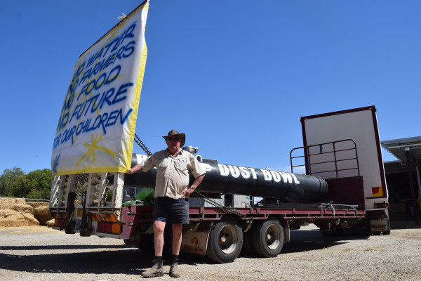 A BIG black pipe loaded onto Lindsay Schultz’s truck trailer bears the slogan ‘from foodbowl to dustbowl’.